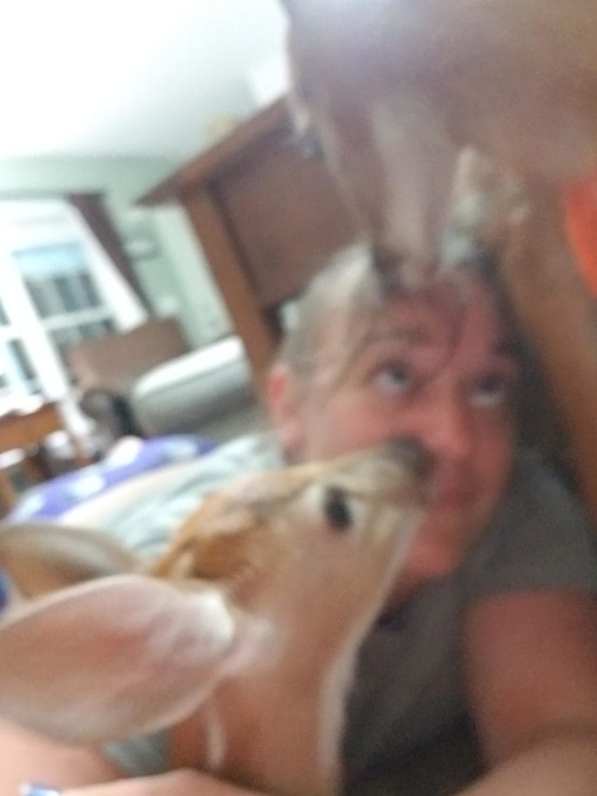 她表示有天在暴風雨來臨之前,她打開了家裡的後門,想說要出門去確認平常她就有在照顧的鹿群們,只是出去後卻到處都沒看到他們的身影。結果等到她回家後才發現,其實小鹿們比她還要早搶先一步,自己就從後門溜進她家裡面等著避難了。