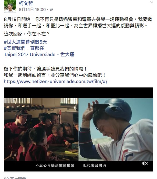 台北世大運將在19日開幕,台北市政府為了宣傳可以說是卯足全力,各式廣告短片和平面廣告都在加強放送,有一名男大生就意外的發現,世大運最新的宣傳影片「選手篇」和「觀眾篇」竟然有「彩蛋」,興奮的在「Dcard」上分享。