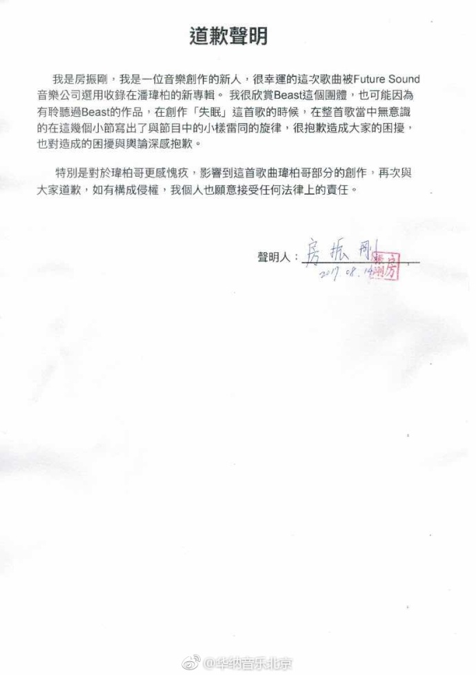 據悉房振剛已經不是第一次涉嫌抄襲Beast的歌曲,而他本人在消息出來沒多久之後,也發表了道歉聲明,他表示自己因為很喜歡Beast,所以才在創作時「無意識」在幾個小節內寫出雷同的旋律,對此他感到很抱歉。尤其對潘瑋柏更感愧疚,因為也影響到了潘瑋柏其他創作部分,他也願意接受法律上的相關責任。