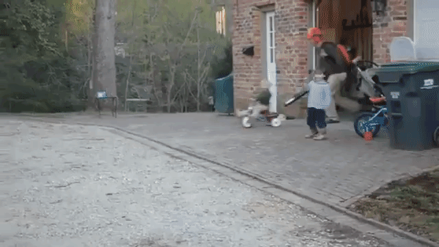 應該發明一個專有名詞給「爸爸帶孩子」,因為好像全世界大部分的媽媽都會擔心這種事情,不相信的話來看看接下來這個,只有爸爸帶孩子時,才會發生的「用吹葉機」幫忙讓小孩飆三輪車!真的很聰明呢!