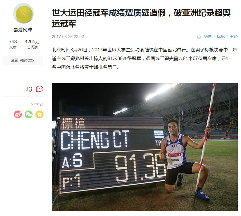 台北世大运中华队田径选手郑兆村在标枪赛时,掷出了91公尺36得好成绩,不只夺下金牌,更打破亚洲纪录,就连德国选手霍夫曼 (Andreas Hofmann) 也成为他的手下败将。不过面对这样的消息,却疑似有中国的媒体和网友质疑该项数据造假,成绩不应该被纪录。