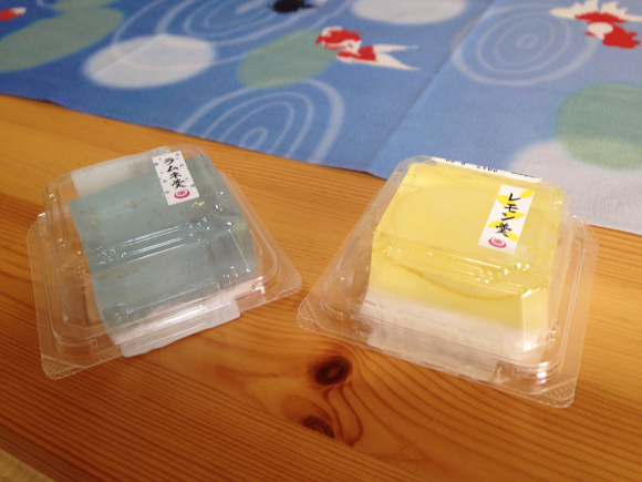 這個甜點和羊羹很類似,但是這次不是用紅豆等東西所製成,這次的商品分別叫做「彈珠汽水羹」和「檸檬羹」,雖然外表看起來像塑膠固體,但他們保證味道和外觀會有很大的反差!尤其是呈現藍色的「彈珠汽水羹」,裡面還有著金色的斑點非常華麗;至於「檸檬羹」裡面有著一大片檸檬,下面白色的部分則是蛋白霜。