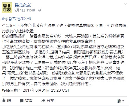 網友在臉書感慨PO文,「妳的優點很多…臉書也是莫名奇妙一大堆人在追蹤,連知名的粉絲專頁也分享妳的直播,讓我覺得跟妳交往的我真的好幸運!」直言對方原本是說要去汽車旅館泡澡,卻沒想到一進旅館就把原PO衣服全脫光,完事後還問「能不能在一起」,讓原PO又驚又喜的,「當然好啊畢竟我喜歡你這麼久」,卻沒想到過幾天後對方竟突然跟他分手,還莫名栽贓他去唱歌時與別的女生亂來,被封鎖的原PO就好奇的用朋友手機翻女方的臉書,這才恍然大悟,「妳居然跟別的男生掛穩交」,直喊自己到底做錯了什麼。