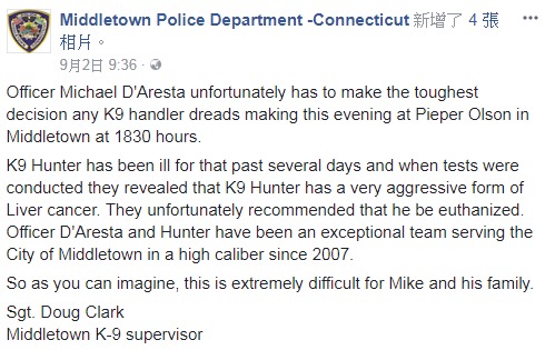 「警員麥可很不幸地在今天傍晚,做出了所有警犬訓練員最害怕面對的一個決定。警犬亨特在幾天前生病了,並且診斷出是罹患很有侵略性的肝癌,獸醫建議將亨特進行安樂死比較好。麥可和亨特這對優秀的搭擋從2007年開始就在米德爾敦市一起服務,所以你應該想像的到,這對麥可和他的家人來說,是多麼心痛且困難的一件事情。」