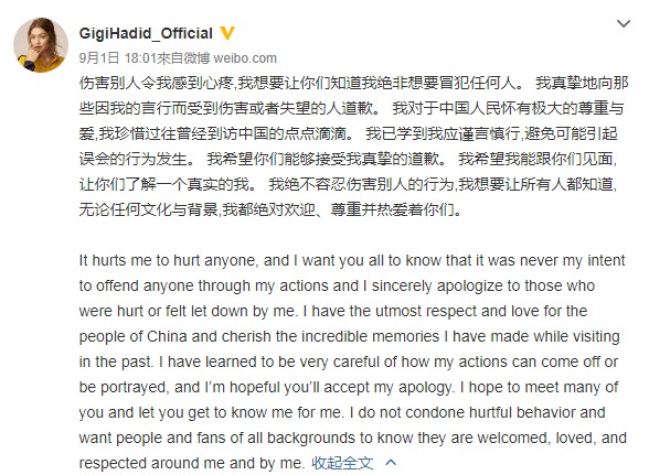 就在1日时,吉吉哈蒂德在官方微博发表了一篇道歉文,为了表示诚意不只有英文还有简体中文,说明她自己从来没想过自己要冒犯任何人,也真挚地想要道歉,「对于中国人民有极大的尊重与爱」,并珍惜到访中国的点点滴滴,以后她将会谨言慎行。