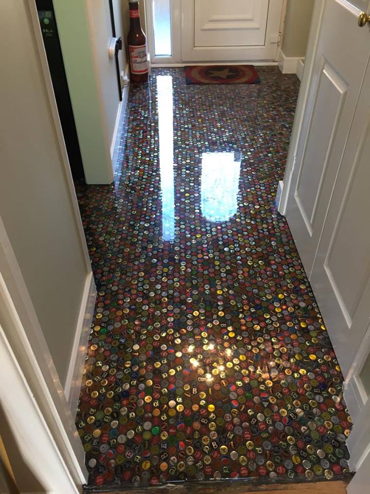 Daniel和他的朋友先整平地板好讓瓶蓋可以平放在地上,然後用矽膠把瓶蓋黏在地板上,再用水泥填滿瓶蓋間的空隙,他們還在水泥裡加了亮粉,等到水泥乾了後,拋光,最後最上層再塗上樹脂當作保護膜。他們的成品顯然非常成功,大家看到時都會引起討論,甚至快遞看到時都驚訝到把包裹掉在地上了!