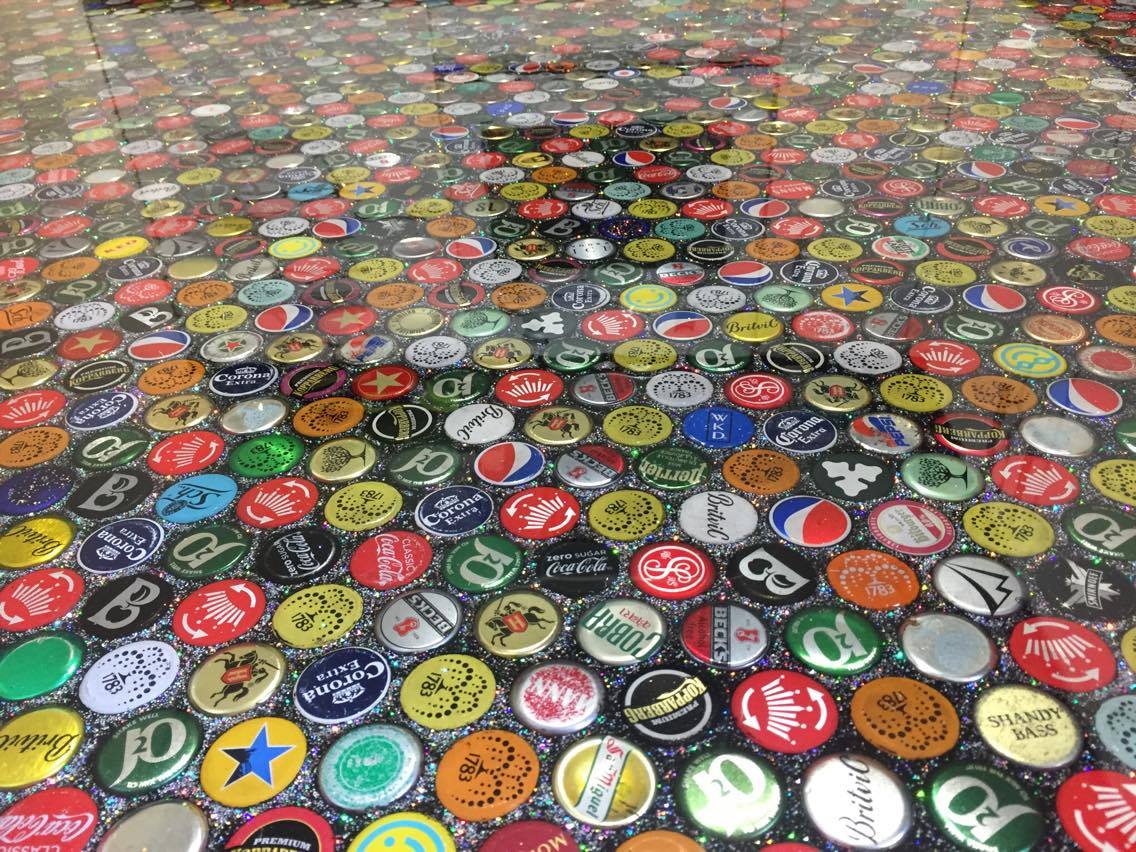 Daniel說:「我是看到有人用硬幣做成地板讓我有了啟發,我從聖誕節開始蒐集瓶蓋,我和我的朋友告訴四、五家酒吧我們的計畫,請他們幫忙蒐集瓶蓋。我花了大約6個月蒐集足夠的瓶蓋,把他們放在一個大箱子裡,然後從6月開始擺放這些瓶蓋。」