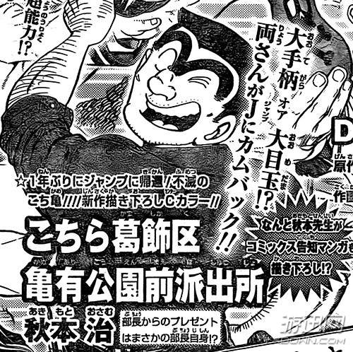 只不過在本月11日發售的《週刊少年Jump》41號刊上,表示《烏龍派出所》即將回歸了!大家也可以重新看到兩津勘吉,而且這不是說說而已,基本上作品差不多完成了,預計將會在下周發行的42號刊上出現,其中當然也會有彩頁。