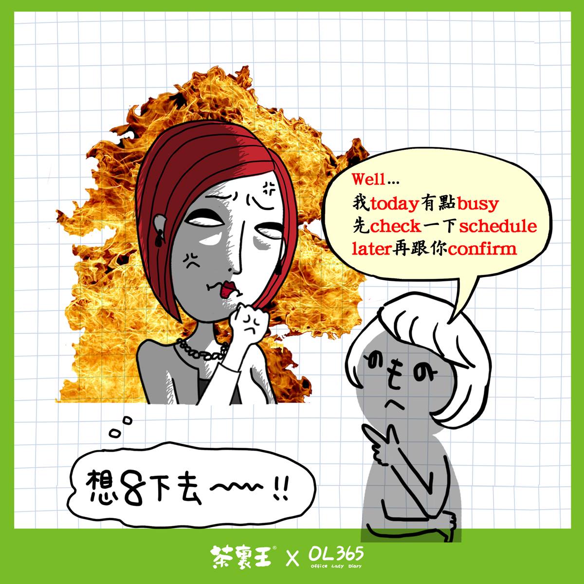 4. 身为前辈,碰到满口爱飙英文的新鲜人时… 前辈:「等下要不要去吃饭?新鲜人」新鲜人:「Well, 我check一下schedule!」面对一问三不知又爱撂外语的新鲜人,前辈该怎么回应呢?