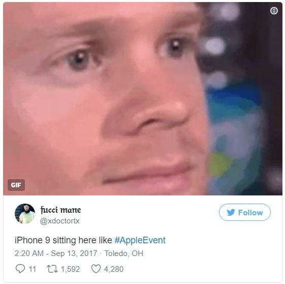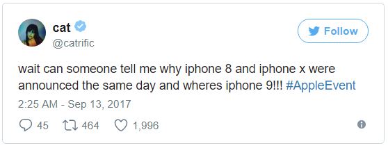 「等等,有人可以跟我說,為什麼 iPhone 8 和 iPhone X 同一天推出了,但 iPhone 9 去哪了?」