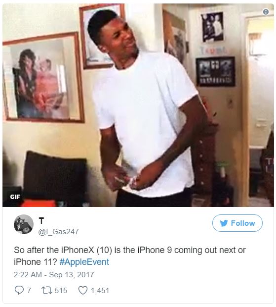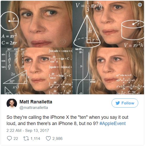 「所以他們把 iPhone X 稱為 10,然後也有 iPhone 8,但沒有 iPhone 9?」