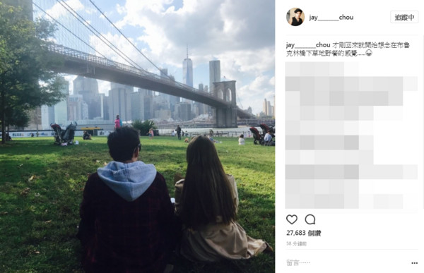 周杰倫自從辦了Instagram後,一解粉絲數十年來對他的好奇,開始大方分享自己的生活。12日秀出一張走在屋頂上的照片,天空有點霧濛濛顯得憂鬱,更寫下「錄影到剛剛,心都走了!」被不少粉絲解讀成「對啊~因為心都飛到紐約了!」其實早在9日時,他就已經PO過和昆凌相依偎在布魯克林橋下野餐的照片,小倆口的背影照也是滿滿的幸福感。