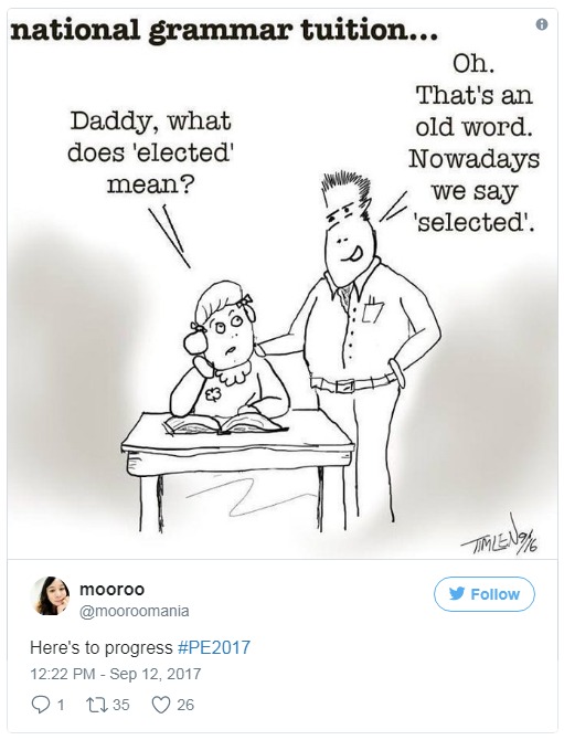 國際文法教學,小孩:「爸爸,『被選舉出來的』是什麼意思?」爸爸:「喔,那是個很老舊的字詞了,現在我們叫它『被選擇出來的』。」