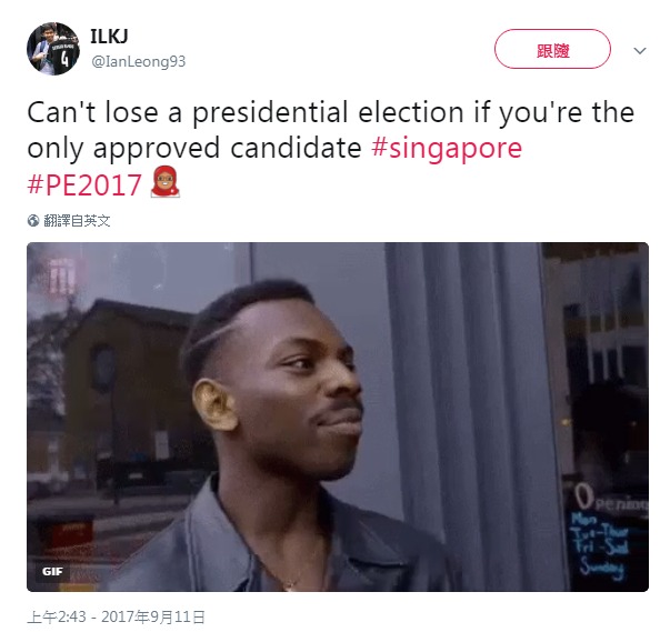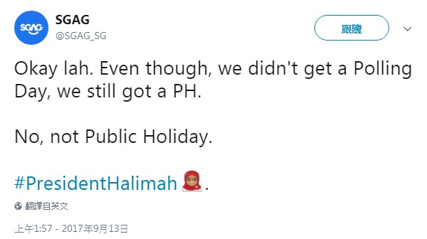 「即使我們沒有『投票日』,但我們還是有一位總統 (PH,PresidentHalimah的縮寫) 。喔,不是國定假日 (Public Holiday) 的縮寫啦。」