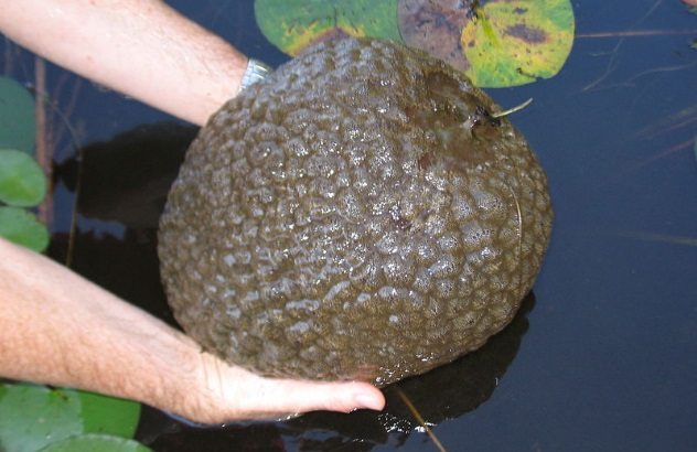 這不是水果,而是一種古生物叫「大型苔蘚蟲」,有褐灰色外型,全身充滿黏液而且雌雄同體,摸起來像鳳梨,長得像大腦,非常奇怪。在加拿大史丹利公園的洛斯特湖、溫哥華和英屬哥倫比亞省都有發現他們的蹤跡,這生物已經存活4億7千萬年了,以水藻為食,而且他們對會破壞淡水生態系統平衡,對環境有害。