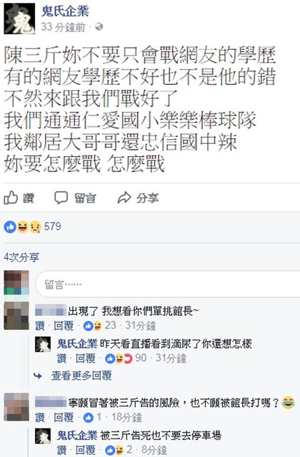 陳沂日前槓上館長,「尊重別人的宗教信仰很難嗎?」已經引來館長不滿後,更批評挺館長的網友「來罵我麻煩最基本的字不要寫錯,別讓館長丟臉,以為他的粉絲都是文盲」一句話讓館長本人挺身而出直接開直播回擊陳沂。想不到過不久,才槓上館長的「鬼氏企業」竟然逮到機會跟風向,在「鬼氏企業」臉書發文「陳三斤你不要只會戰網友學歷,有的網友學歷不好也不是他的錯,不然來跟我們戰」、「妳要怎麼戰就怎麼戰」,但當網友問到要不要單挑館長,他們也令人噴飯的回答「昨天看直播看到滴尿了你還想怎樣?」、「被陳三斤告死也不要去停車場!」