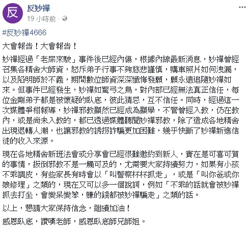 最后网友还说如果要扳倒邪教,需要大家一起努力,并说以后家长如果要吓唬小孩,别再说会被警察抓走了,现在多了种说法是「不乖的话就会被妙禅抓去打坐,会变呆变笨,赚的钱都被妙禅骗走」,他也感恩那些卧底的师兄师姐,才有消息可以提供给大家知道。