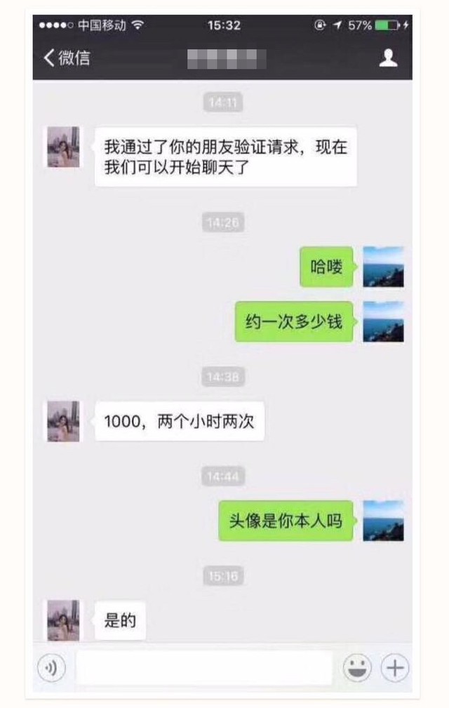 對話記錄可以看到男子在問這名很正的援交妹「約一次多少錢」、「頭像是您本人嗎?」等話語,想確定對方是不是真的。最後以1000元人民幣 (~4500台幣) 約好見面。