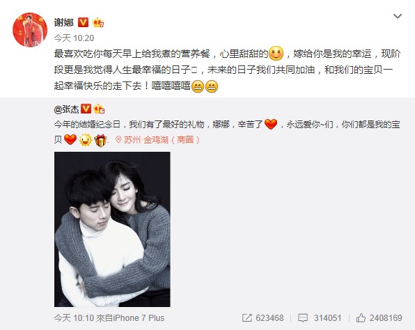 如今張傑開心分享他們在結婚紀念日有了最好的禮物,並對謝娜說聲辛苦了!表示會永遠愛著她和肚子裡的小孩。謝娜也是在微博上寫下,感謝老公每天早上煮營養餐給她吃,「嫁給你是我的幸運,現階段更是我覺得人生最幸福的日子,未來的日子我們共同加油,和我們的寶貝一起幸福快樂的走下去!」面對一直放閃的夫妻,粉絲們則是紛紛獻上祝福。