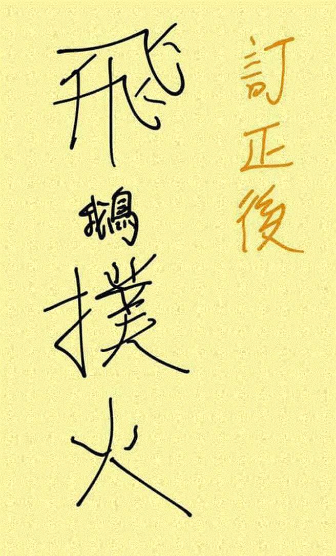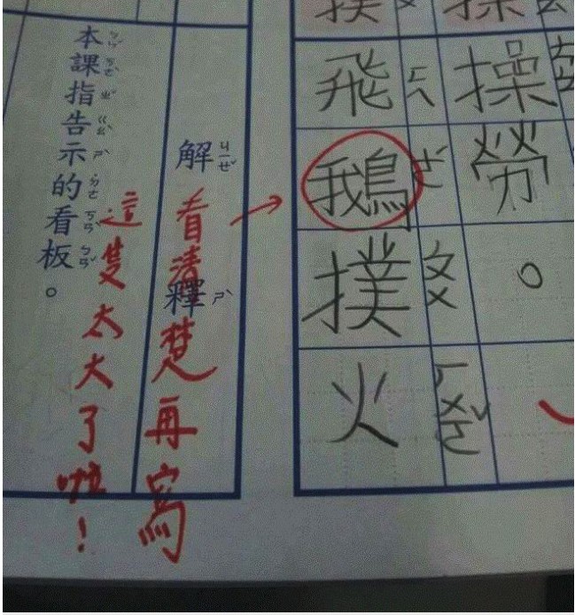 照片中只見小朋友在作業簿上寫下「飛鵝撲火」,老師原本想要大展幽默地給予指導,於是就在錯字旁邊寫下「看清楚再寫,這隻太大了啦!」沒想到這位小朋友相當的老實,把「鵝」字縮小寫出來,讓老師看完哭笑不得。