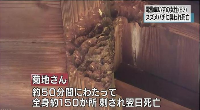 爱媛县大洲市长浜町一名叫菊地智惠子的87岁老妇,9月11日下午4点左右,在从老人日照中心回家的途中,经过了附近屋簷下的蜂巢,遭到大量蜂群攻击,一旁的照顾服务员也被攻击,只好暂时离开并拨电话向日照中心求救,救护队赶到现场时,菊地老太太已经被数百只大黄蜂包围螫咬,虽然救护人员尝试驱赶蜜蜂,并试图在老妇身上穿上雨衣降低伤害,但由于医护人员未准备防护衣,因此也无法靠近老妇。