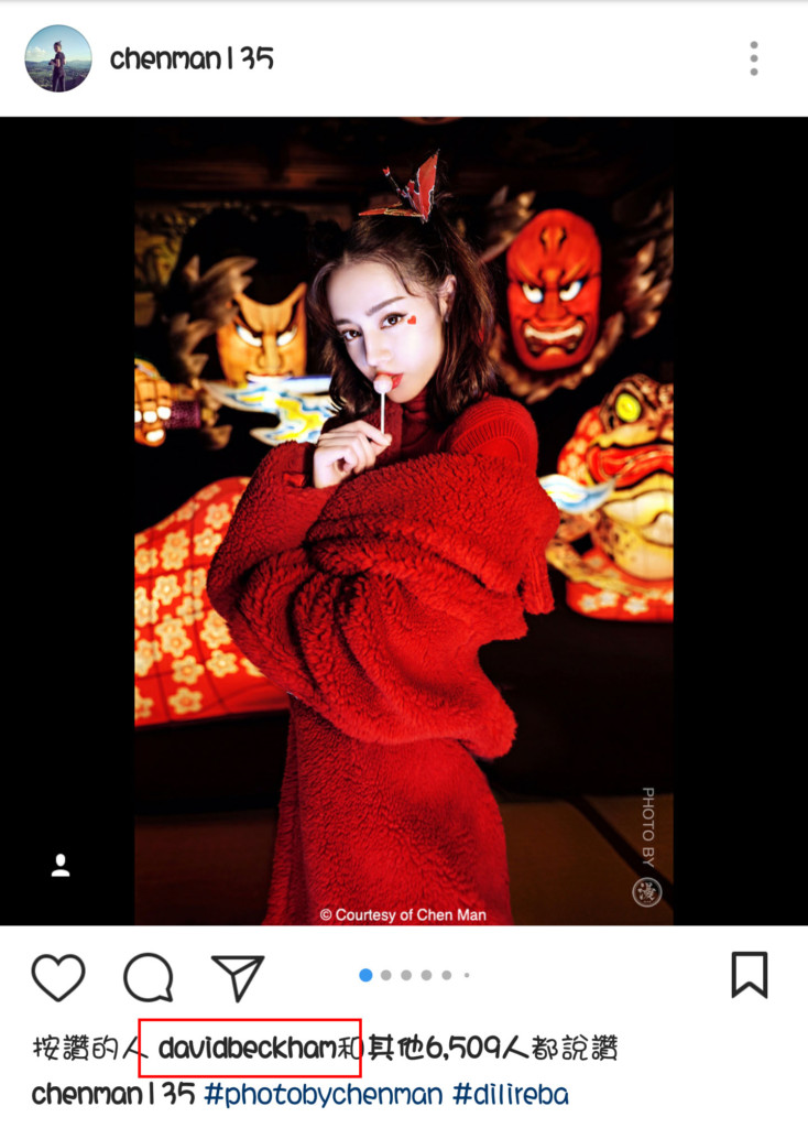 大陸女藝人迪麗熱巴有著漂亮的臉蛋,以及可愛不做作的個性,讓她有著不少死忠粉絲。日前大陸知名女攝影師陳漫在IG上,分享了一系列她幫迪麗熱巴拍攝的雜誌照片,吸引了大批粉絲前來朝聖,沒想到在按讚的人裡面,網友們眼尖發現也有知名球星大衛‧貝克漢,讓大家直呼難道他也是被迪麗熱巴的美貌所吸引了嗎?!