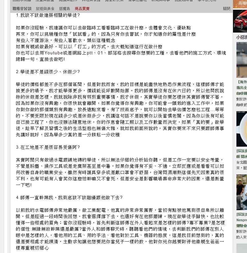 過去幾年若是不讀大學,可能會招來異樣的眼光,但是到了現在大學生滿街都是,反而卻開始重視起「技能」這件事,其實各行各業都有值得被尊重學習的地方。網友阿閎就相當深刻體驗的,20歲從清大退學後的他,做過許多工作,最終走上鋪地磚學徒的道路,花了很多時間、精神去學習,但除了本身的專業之外,他意會到一件相當重要的事情…