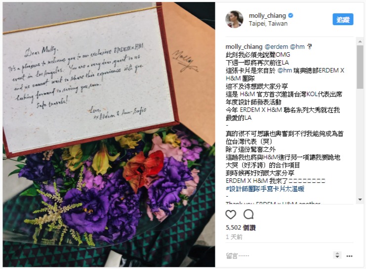 莫莉表示她即將前往洛杉磯,這次是以台灣KOL (Key Opinion Leader關鍵意見領袖) 代表的身分出席,讓她開心地直呼OMG (Oh my god) 。除了出席活動之外,莫莉還賣關子說「也將與H&M進行另一項讓我要跪地大哭的合作項目」,讓粉絲們非常期待她日後的分享。