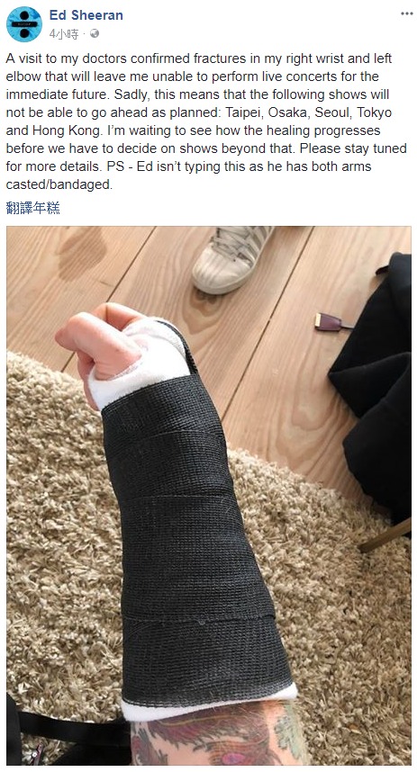 「在看完医生后,确定我的右手腕和左手肘骨折了,这让我在最近将无法进行现场演场会,很遗憾的是,这代表这些活动将无法如期进行:台北、大阪、首尔、东京和香港,我们将会看我的治愈状况来评估能否表演,请密切注意更多细节。PS:这段文字不是艾德打的,因为他的双手被包扎固定住了。」