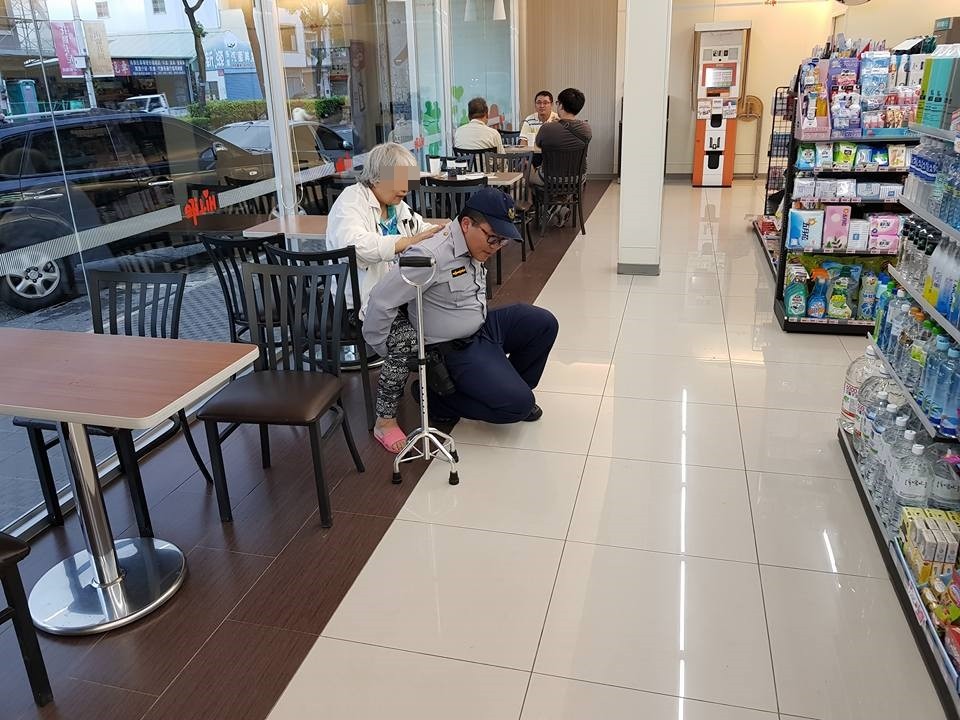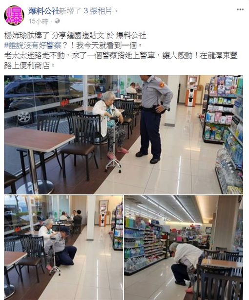 有民眾在臉書爆料公社表示,17日傍晚在桃園龍潭東豐路上一間便利商店看到一名迷路的老奶奶,拄著拐杖,貌似已經走不動的樣子,無助地坐在超商裡,警察到場後先和老奶奶說話、安撫她的情緒,接著竟蹲下身來,揹著老奶奶上警車送她回家,這溫馨的畫面被網友全程目擊,更說「誰說沒有好警察,我今天就看到一個。」