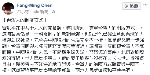 10月18日至24日時在北京召開中國共產黨第十九次全國代表大會,領導人習近平強調兩岸的對話要建立在「一個中國」上,也重申了九二共識原則,只有這樣才能進行和平溝通。雖然習近平也說他們「尊重台灣人的制度方式」,但台灣作家卻認為這段話令人「不寒而慄」。