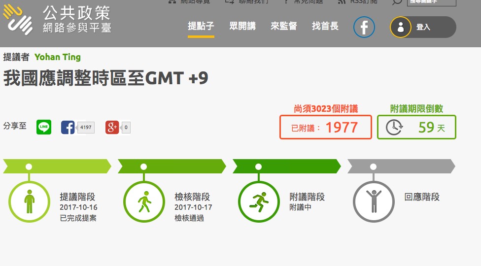 網友們在網路上表示,台灣過去其實也曾經屬於「GMT+9」的時區,跟台灣差不多經度的像是南北韓也都是「GMT+9」,因此若調整可以象徵性地脫離中國從屬,而且以地理位置來看,若提前一小時,冬天下班時間也不會那麼黑、夏天也可以充分利用陽光。而這起在「公共政策網路參與平台」的提議,只要在60天內達到5000人連署,主管機關就會回應,目前已有1900多人參加。
