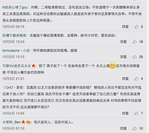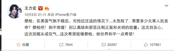 王力宏在槍擊案後在微博上發下貼文,希望「禁槍是刻不容緩的事情!」沒想到一則愛好世界和平的貼文,卻成了網友的炮灰,有網友認為「在微博發幹嘛?外國人又看不到?」、「在中國賺了一堆錢,祖國有事情不發!」、「這社交平台都是中國人!」、「搞不清楚狀況難怪現在都不紅了!」、「賺中國錢賺爽了還是不忘美國!」其實說穿了,就是中國網友認為,在中國國慶期間,王力宏並沒有發文祝賀,反而卻為了美國槍擊案而發啊!