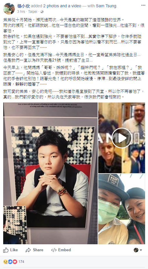 以下是杨小玫PO的短文,内容让人知晓了弟弟最后应该是追到强光了,她说:「我是安心的,但是充满不舍…今天是妈妈生日,他一直希望弟弟陪他过生日…但是我们一直以为昨天就是21号,提前过了生日…」,还说弟弟在走之前还问妈妈,哥哥姐姐去哪了,还想念了家里么猫咪,之后才陷入昏迷。