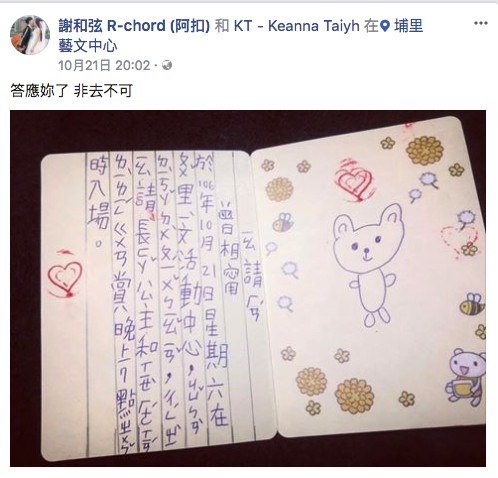 歌手謝和弦 (阿扣) 雖然說話犀利,但是愛妻形象深植粉絲內心,而且對待粉絲也是相當親民,更會適時的教育粉絲「待人處世道理」,日前他收到一封來自家鄉南投埔里的邀請函,內容有一半都是注音,原來是一位小妹妹希望邀請偶像阿扣跟老婆 (卡片中寫長髮公主) 到現場看肚皮