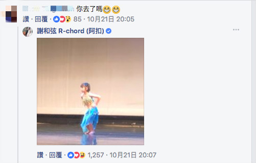 接著下方有網友留言「結果有去嗎?」原以為只是單純的曬出粉絲邀請函,沒想到謝和弦直接曬出一張小妹妹跳肚皮舞的照片,證明自己真的到了現場,也在台下支持。被粉絲們大讚「答應別人的事情就要做到,這就是守信用的態度,也是孩子最好的榜樣!」