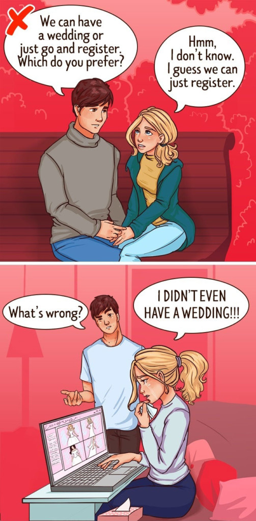 男:「我們可以有個婚禮,或是直接去進行登記,妳比較想要哪一個?」女:「嗯,我不知道,我猜我們可以只登記就好。」/男:「妳怎麼了?」女:「我甚至連個婚禮都沒有!」