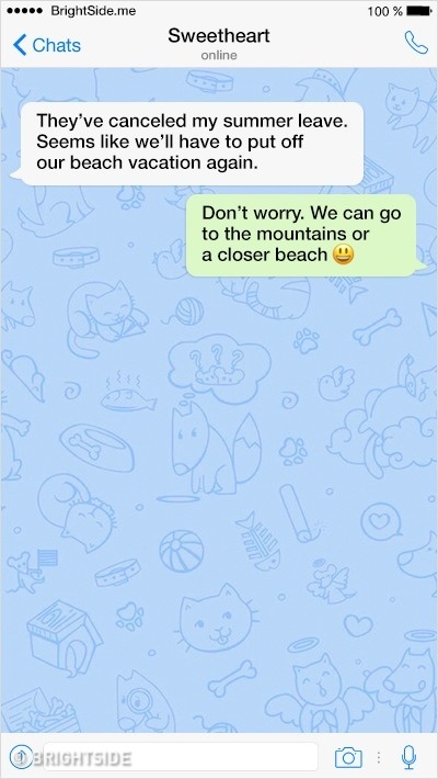 「他們取消我的暑假假期,看起來我們要再一次推遲去海邊度假的計劃了。」/「別擔心,我們可以去爬山,或是去近一點的海邊就好。」