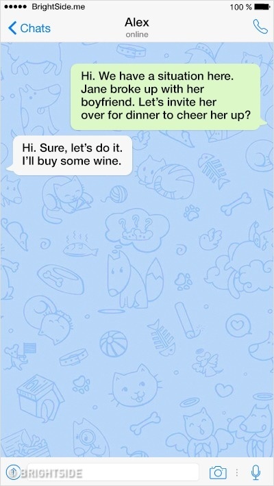 「嗨,我們現在有一個狀況。珍和他的男友分手了,我們邀請她一起吃晚餐,並且幫她加油打氣好嗎?」/「嗨,當然好,就這麼做吧!我會買一些紅酒。」