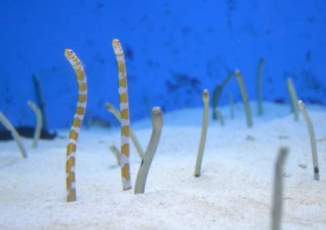 大家知道什麼是「花園鰻」嗎?他們就是圖中這些可愛的條狀小傢伙!花園鰻的下半身埋在沙子裡,只會露出一小節上半身,隨著海流搖頭晃腦的傻萌模樣看起來非常療癒,讓他們在日本大受歡迎。