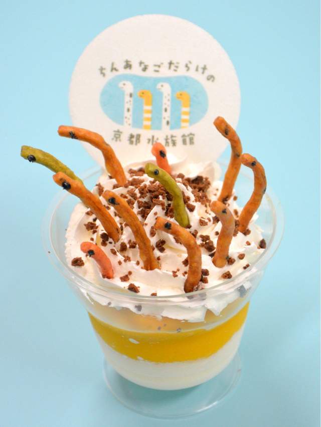 由於「11」月跟他們的形狀非常像,因此京都水族館還特地推出了期間限定的「花園鰻聖代」,完美再現花園鰻在沙子裡晃來盪去的樣子!