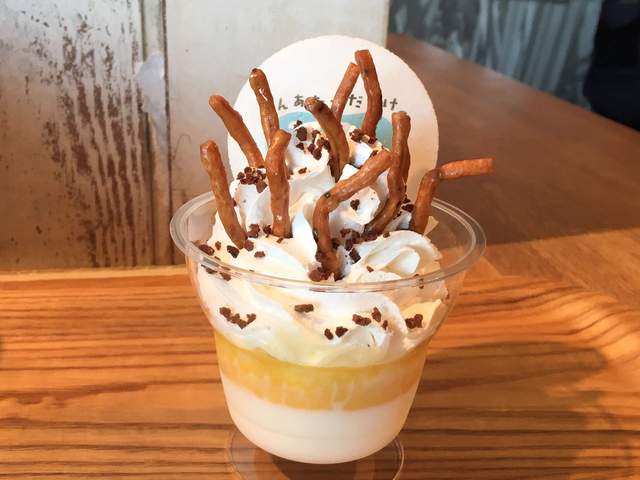 這個就是「花園鰻聖代」! 上面插滿跟花園鰻87%像的蔬菜花林糖 (還弄了小眼睛),下面則是芒果和牛奶布丁,再現度非常高,而且賣相超可愛的~