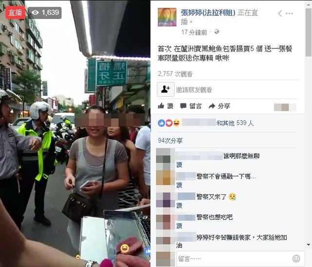 法拉利姊「張婷婷」日前經營賣黑鮑魚香腸餐車,因為不斷的被檢舉告發,導致賣不下去還開直播訴苦,「只要臉書一開直播,立刻警察就找上門!」邊哭邊罵髒話讓網友好心疼,好不容易14日再度鼓起勇氣開賣得到網友的支持,沒想到15號到蘆洲做生意,不到17分鐘警察又出現。