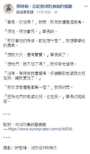 原PO透露当时还是菜鸟时,好奇的问老学长「学长,你怕吗?」、「那你害怕的时候,都在想什么?」原以为老学长会打嘴砲回应,但学长收起玩笑,正经的说「很怕,很怕会死啊」,并透露害怕的时候,会想着妻小,才会让他不怕死的往前冲,对于这回答让原PO更好奇的追问「想她们,就不怕了吗?」而学长却回应,「没有,有时候我还觉得,好像听到老婆跟女儿在哭,让我更怕了」,坦言就是这份害怕,让他感同身受「他们的老婆女儿,也在哭」,因此不畏惧的冲第一个搭救。
