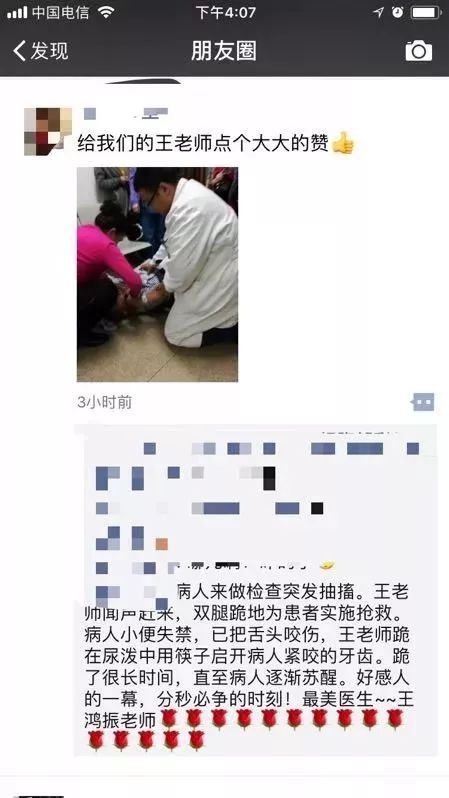接著王醫師協助家屬把患者護送到主治醫師那後,又回到自己的工作崗位上,直到下班才發現自己的朋友圈裡都是自己的照片,但他表示「醫生每一天都會面臨這樣的突發情況,救人的時候哪管是站著還是跪著,就是一個信念,一定要把患者救回來。」