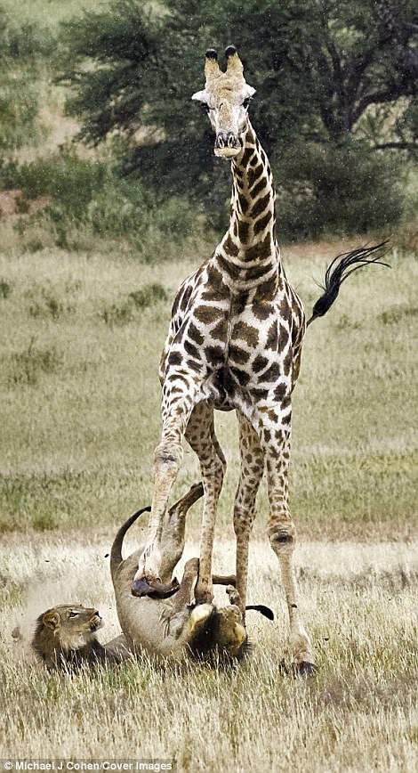 只是柯恩觀察發現,長頸鹿似乎有意避開踩死獅子,也許這也是草食動物缺少掠食的本能,這讓獅子暫時擺脫危險。沒多久雙方都出現疲累的樣子,而柯恩他們則是在一旁等待是否有後續,40分鐘後2頭獅子果然開始慢慢進攻,最後2隻獅子合作無間地順利殺死了長頸鹿,也飽餐了一頓。隨著柯恩的照片,也讓人一睹珍貴又驚人的畫面。