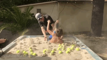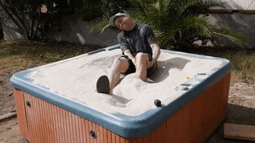 在小小的塑胶盒里面成功后,马克立刻打造了一个巨型的沙子浴缸,而他就像小孩子一样在沙子里「游泳」著,甚至还用来吓唬他的姪子们,当然后来小朋友们也在沙子浴缸里玩疯了。最后他也简单的解释了原理,有兴趣的人可以跟着动手做喔!
