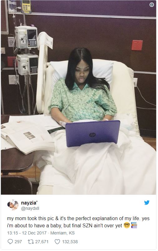 她在推特上發文:「我媽拍了這張照片,這完全就是我現在的生活。沒錯,我快生孩子了,但期末考還沒結束阿。」這則推文很快地就吸引10幾萬網友按讚。