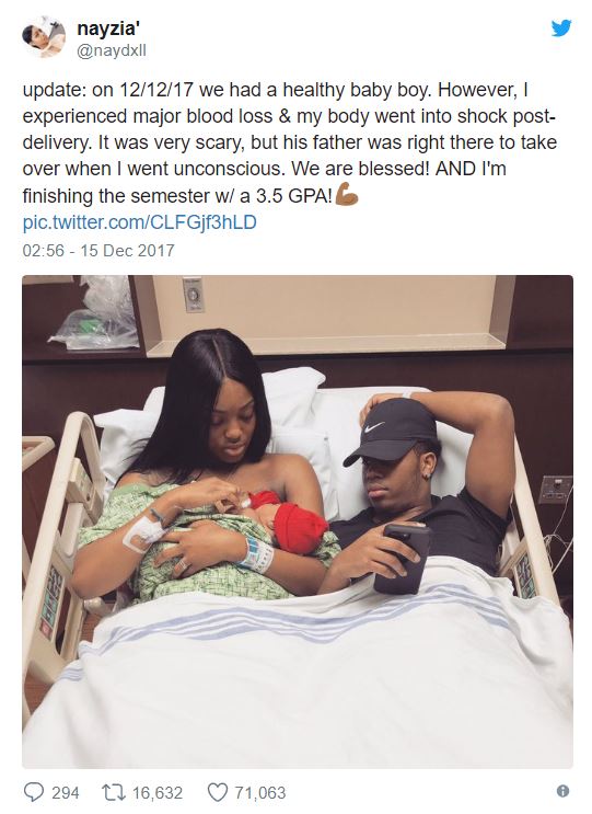 「更新,2017年12月12日,我們有了健康的男孩,但其實我那天大量失血,生產前一度失去意識。那真的很可怕,幸好孩子的爸爸就在旁邊照顧著我,我們是受到祝福的!對了,我這學期成績是3.5GPA唷!」