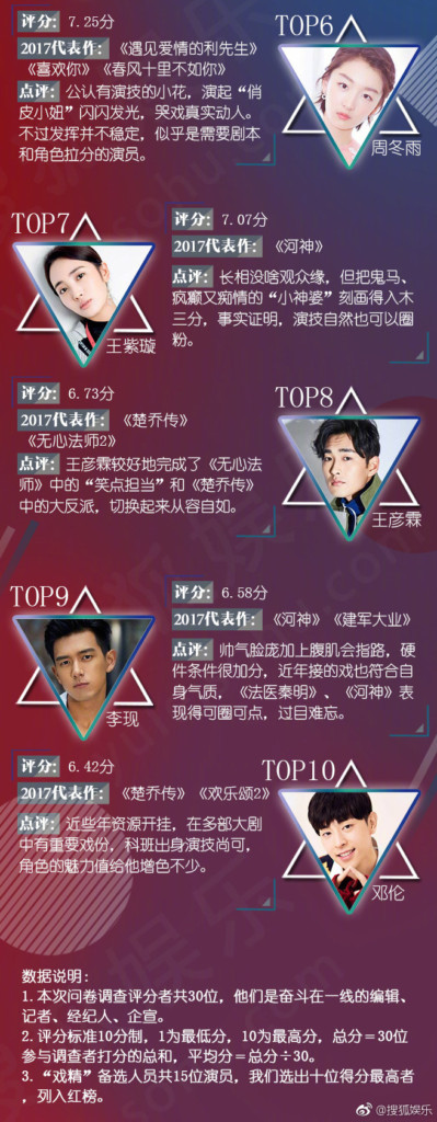 而在戲精的部分,先前火熱播出的《楚喬傳》中,4名演員趙麗穎、竇驍、王彥霖和鄧倫各佔3、4、8、10名,戲劇火紅程度果然都得到粉絲們的讚賞。